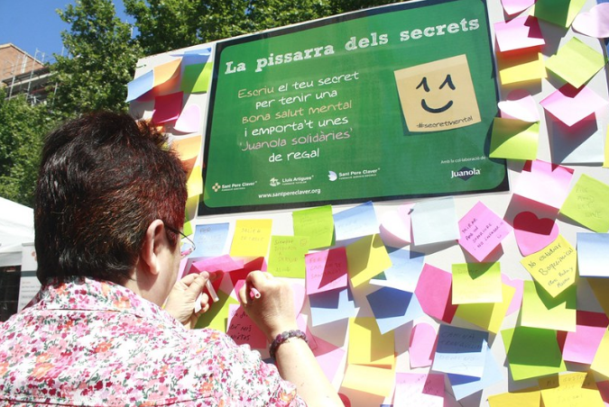 02/06/2015. Després de l’èxit de la passada #FirEntitats de Sants (16 maig), la “Pissarra dels secrets per tenir una bona salut mental” tornarà a veure la llum el pròxim dissabte 6 de juny durant tot el dia amb motiu de la Mostra d’Entitats del Poble-Sec, organitzada per la Coordinadora d’Entitats del Poble-Sec. Tothom qui deixi el seu #secretmental a l’estand de Sant Pere Claver s’emportarà unes “Juanola solidàries”de regal.